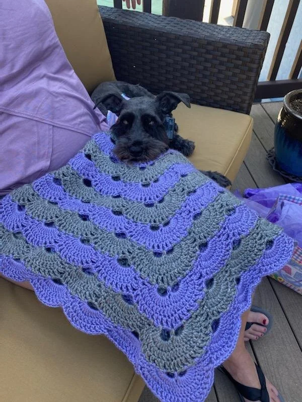 Awhile back I got a commission to make a baby blanket for a baby shower. The recipient finally received it, but looks like the blanket has been claimed by their dog Daisy! Pattern is called Virus Blanket by Jonna Martinez.