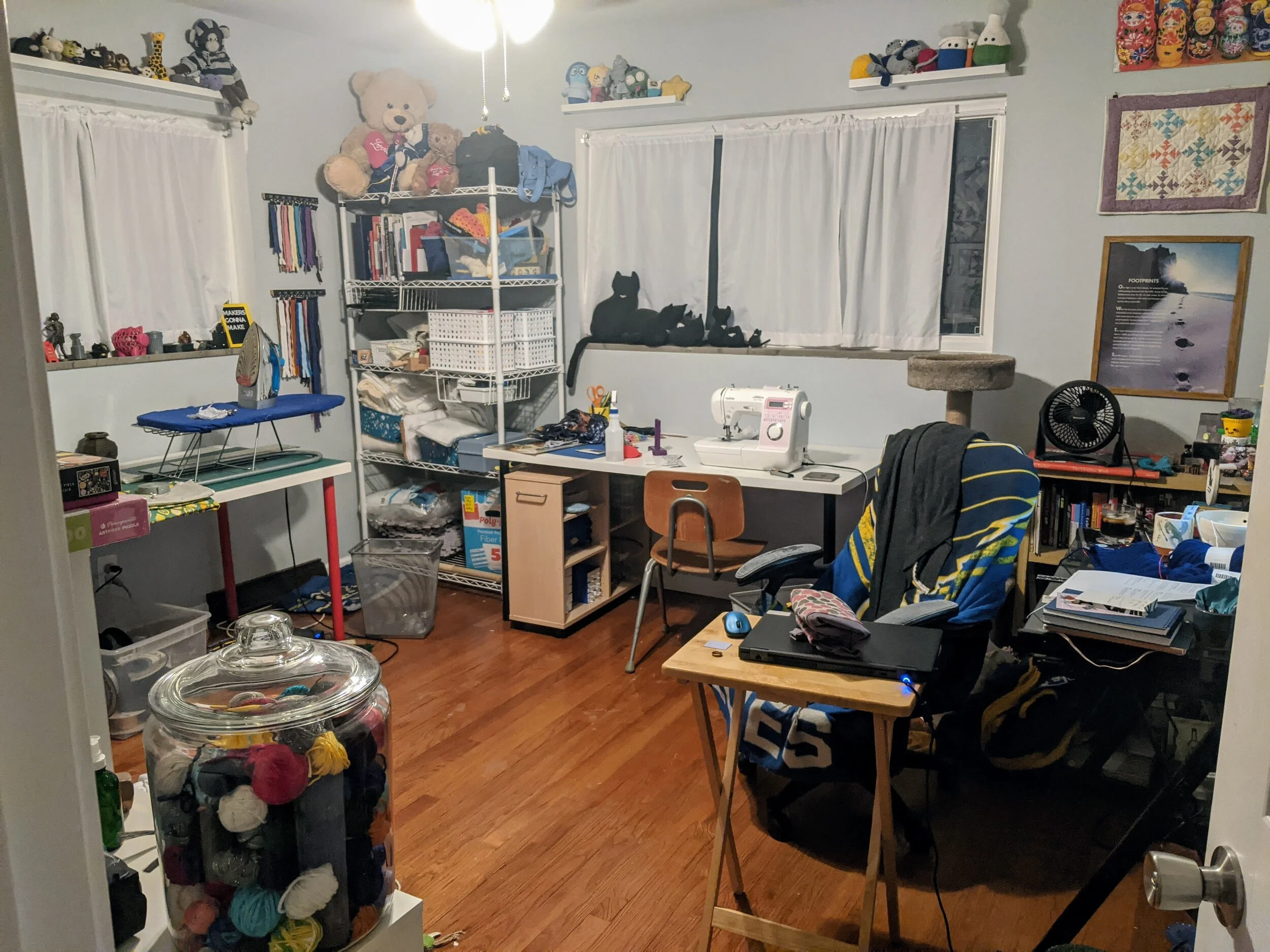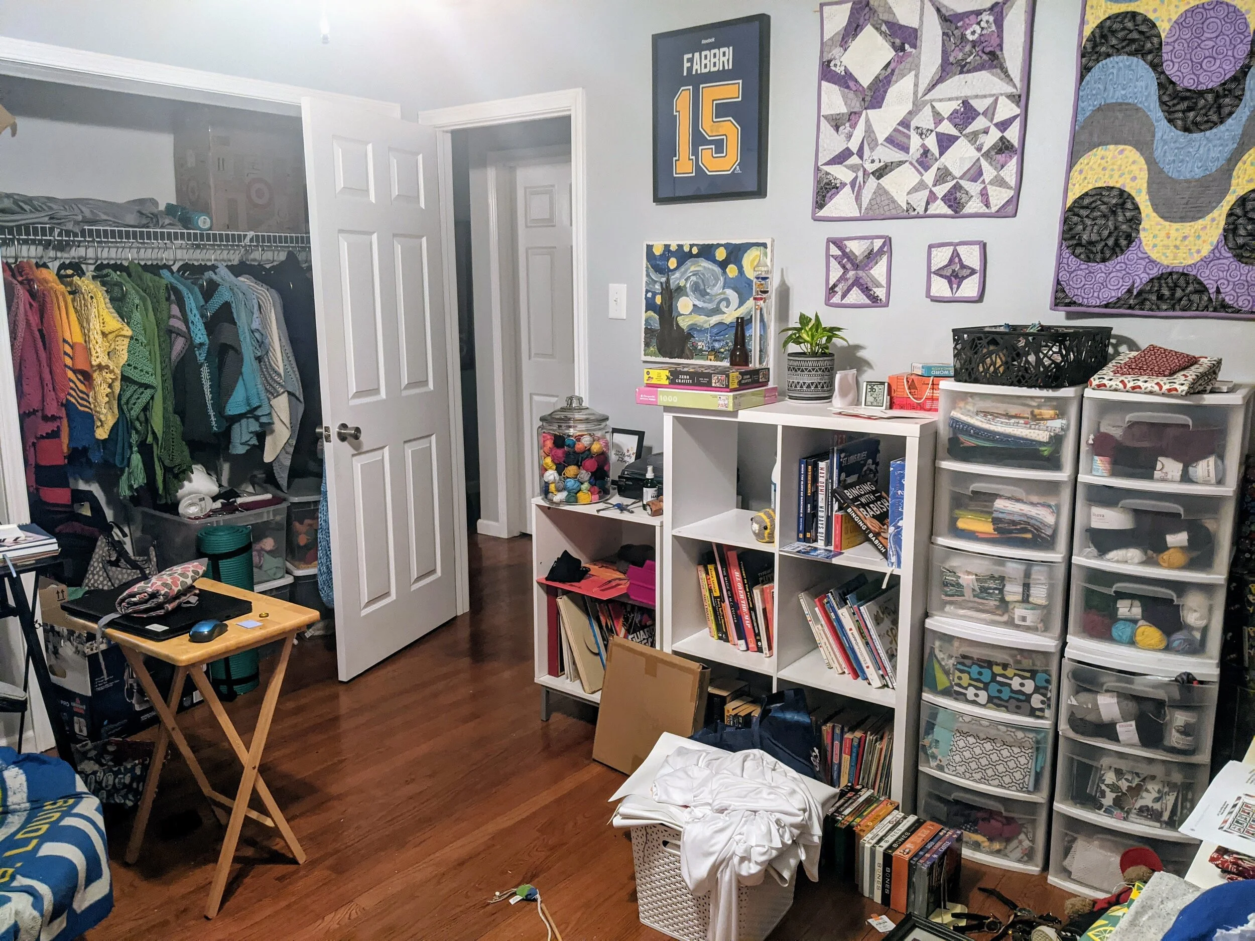 One of the silver linings about 2020 is that in our new house, I got expanded studio space. I'm able to fit 2 extra bookshelves, a record player stand, a cat tower, plus I have the whole closet to hang my shawls and store my stash of handknits. I have enough room on my floor to baste lap size quilts and I have more wall space to hang up things that bring me joy. Yes, it's messy and there's lots more to do to fix it up, but I love my new studio and can't wait to spend more time here. #meetthemakerweek #shareyourstudio #makersgonnamake #makermovement #studio #workspace #silverlining